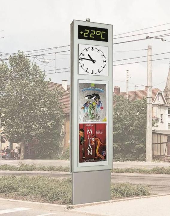 Stadtuhr mit Werbeschaukasten Digitalanzeige (Temperatur) Ziffernhöhe von 100 mm , 4-stellig, Ableseentfernung ca. 50m, Ziffernfarbe ist gelb 7-Segment LCD-Anzeige für den Außenbereich Hervorragende Ablesbarkeit (bei direkter Sonne oder Dunkelheit im Blickwinkel von +/-70°) Temperaturbereich von -30 bis+90 °C Extrem niedriger Energiebedarf, keine Geräuschbildung und keine Verschleißteile Analoguhr Ziffernblatt aus schlagzähem, weißen Acrylglas mit Stundenbalken bedruckt, im Durchmesser von 500 mm revisionsfreundlich befestigt und vollflächig hinterleuchtet Hochwertiges Uhrwerk mit Stunden- und Minutenimpuls (Impulsanpassung 12 oder 24 Volt) Netzbetriebene Funkuhr für den Außenbereich, vollautomatische Zeigereinstellung Automatische Umstellung von Winter- auf Sommerzeit Werbekorpus Sichtfläche 585 x 1680 mm Monosockel für eine einfache Montage ausgelegt