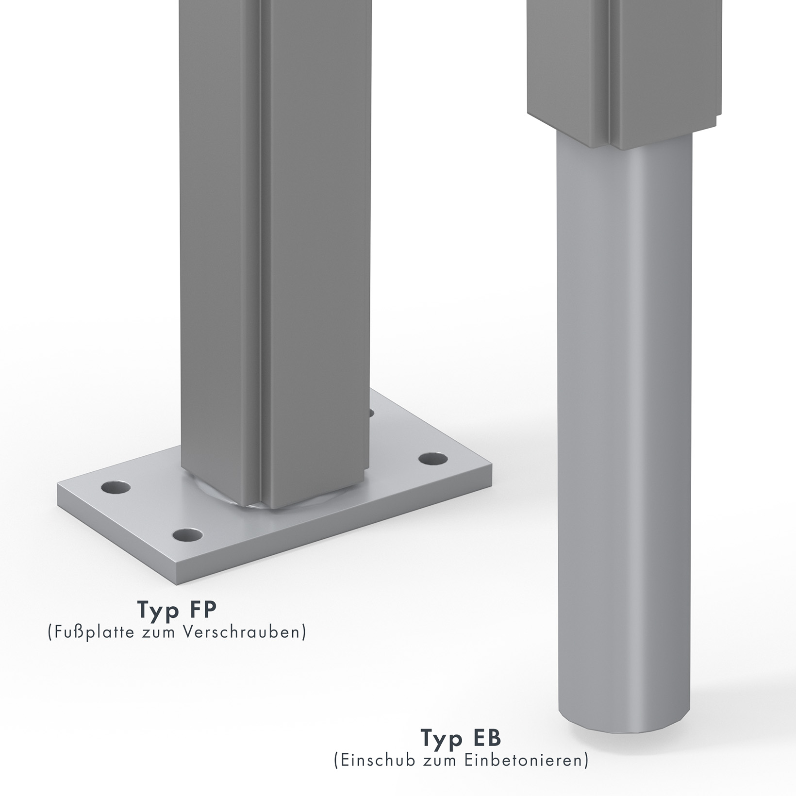 | Standbeine: | mit Standbeinen zum Aufdübeln, mit Standbeinen zum Einbetonieren |