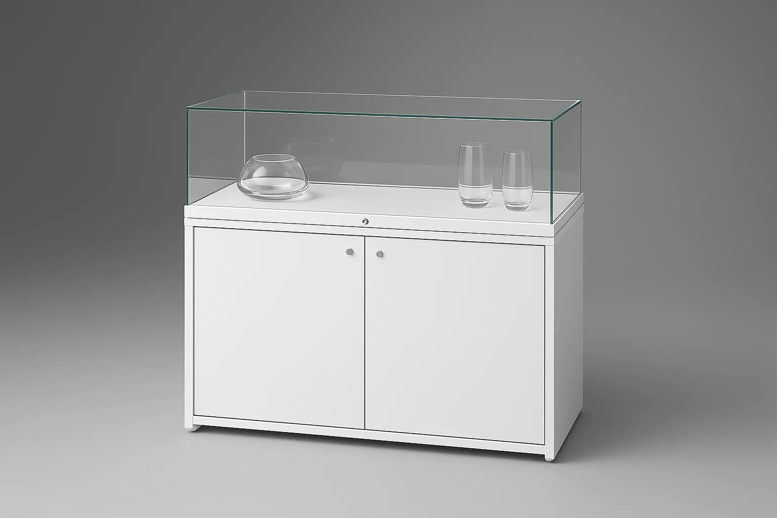 Tischvitrine mit Unterschrank - die variable Vitrine mit Stauraum im Sockel - auf Wunsch mit Brandschutz   Profil-Ansicht von 32 mmHöhe des Glaskorpus 300 mm Größen B/H/T1020 × 970 × 520 mm1220 × 970 × 520 mm1520 × 970 × 520 mm Öffnung - GlasschiebetürenVerglasung - Einscheiben-Sicherheitsglas / ESGOberfläche - Eloxierung in matt-silber (E6/EV1)Beschichtung - Classic RAL Farbe nach Wunsch (nur Profile)Beleuchtung - ohne Beleuchtung - optional: waagerechte Strahlerschienemit LED-Strahlern, inkl. TrafoSchließung - Sicherheitsschloss mit 2 Schlüsseln